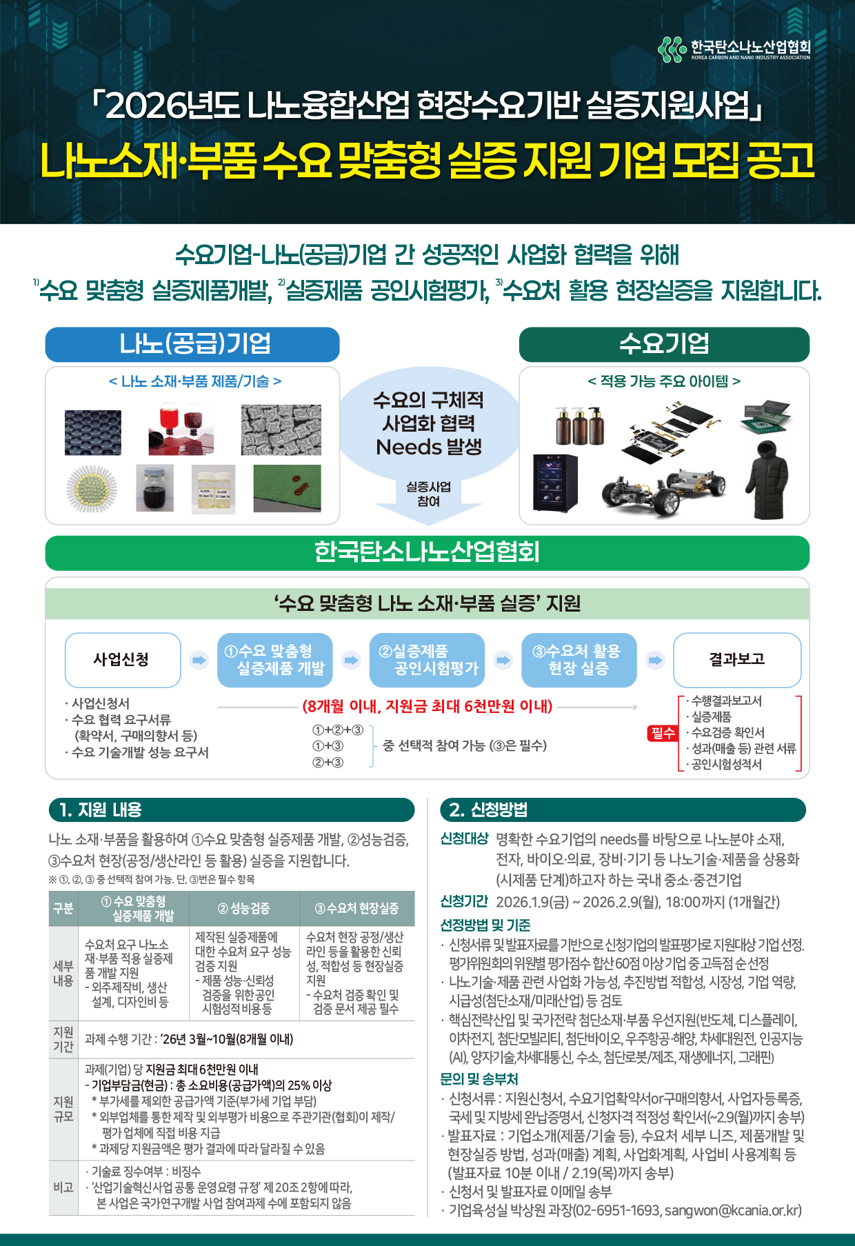세부 일정 추후 안내 - 신청기간 : '26. 1. 9(금) ~ '26. 2. 9(월), 18:00까지(1개월간) - 신청서류 : 지원신청서, 수요협력 요구서류(확약서, 구매의향서, 기술개발요구서 등), 신청자격 확인서, 사업자등록증, 정보수집동의서, 국세 및 지방세 증명서 등(~2.9(월)까지 담당자 메일 송부) - 발표자료(10분) : 기업소개, 적용된 나노소재/제품/기술 연관성, 수요처 세부 니즈, 제품개발 및 현장실증 방법, 성과(매출)계획, 사업화계획, 사업비 사용계획 등(~2.19(목)까지 담당자 메일 송부) - 문의처 : 기업육성실