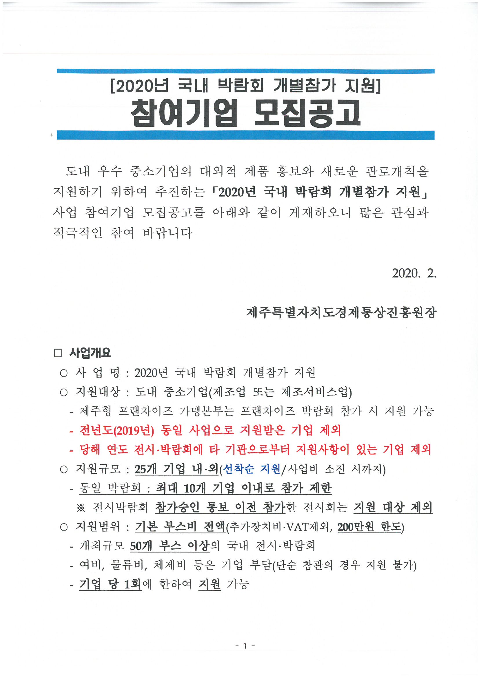 [신청가능] [제주시] 2020년 국내박람회 개별 참가기업 모집 공고