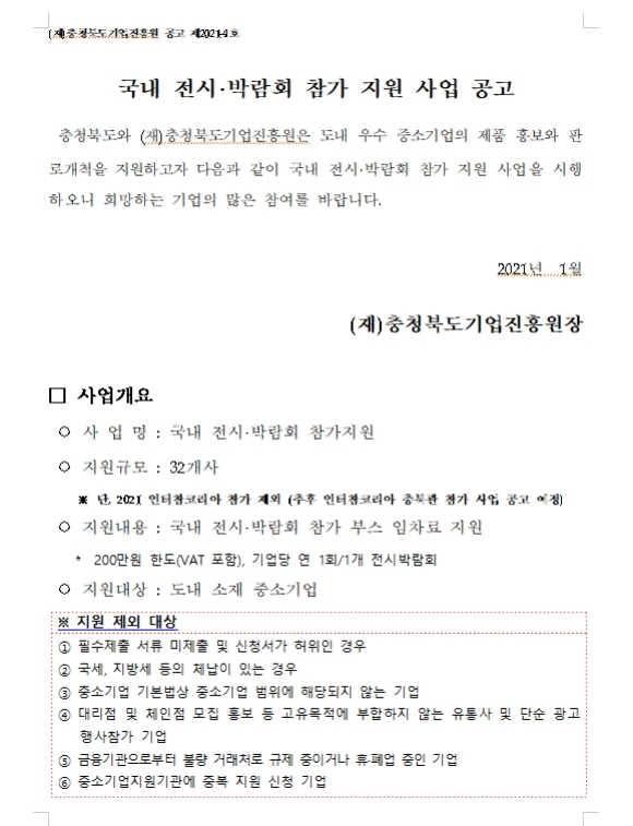 [충청북도] 2021 국내전시박람회 개별참가 지원사업 참가업체모집