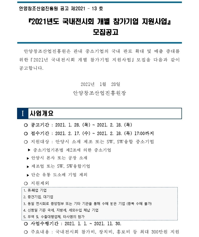 [안양시] 2021 국내전시회 개별 참가기업 지원사업 모집공고