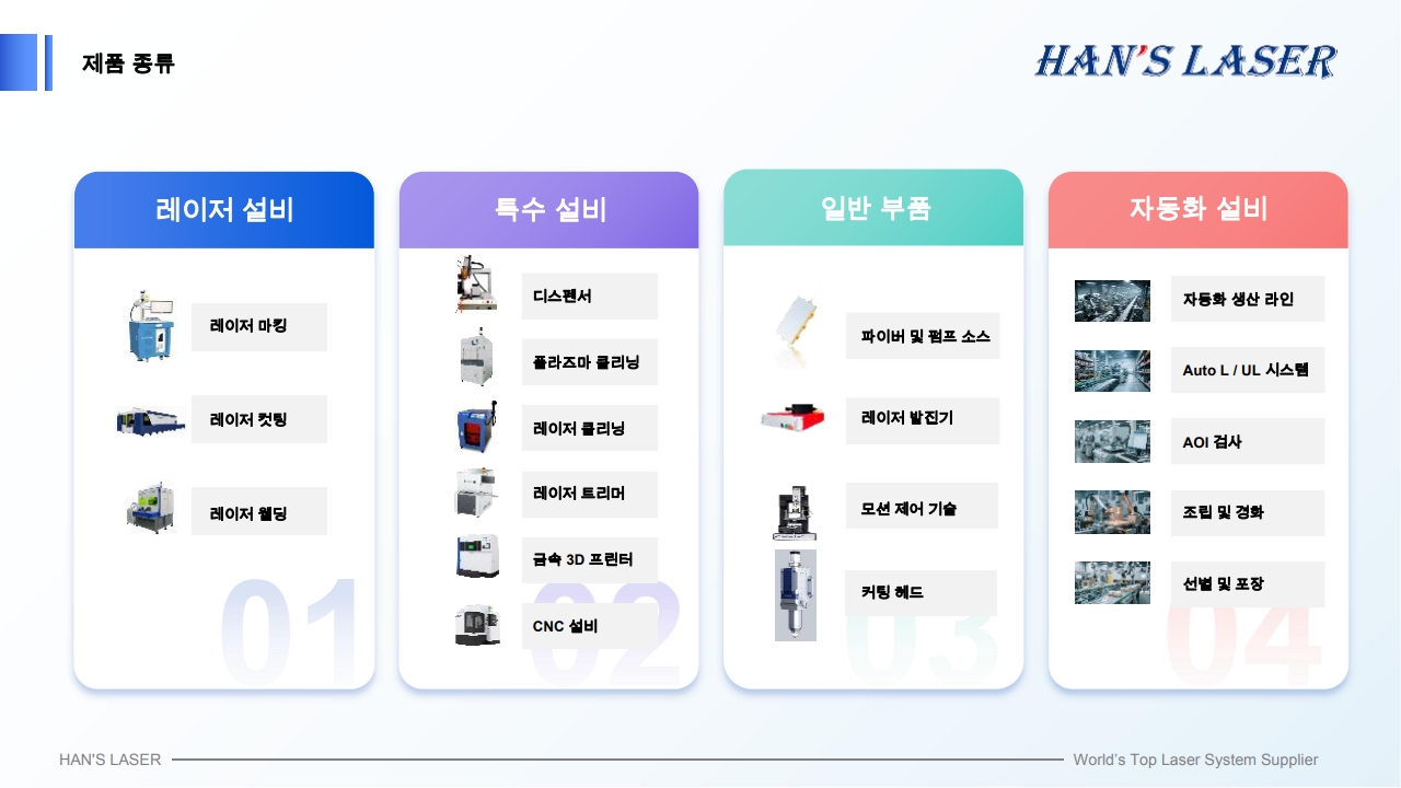 한스레이저는 세계적인 상장 기업으로, 최신 산업용 레이저 장비를 생산하며 견고한 재무 구조와 기술력을 입증해 왔습니다. 한국지사인 한스레이저코리아는 서울과 구미를 거점으로 영업 및 사후 관리 시스템의 완벽한 현지화를 실현했으며, 국내외 기업들의 글로벌 기술 파트너 역할을 수행 중입니다. 마킹, 용접, 절단, 디스플레이 등 산업 전반을 아우르는 폭넓은 설비를 보유하고 있으며, 특히 자외선 레이저 등 핵심 기술과 수많은 특허를 바탕으로 레이저 산업 내 글로벌 기술 리더십을 공고히 하고 있습니다.